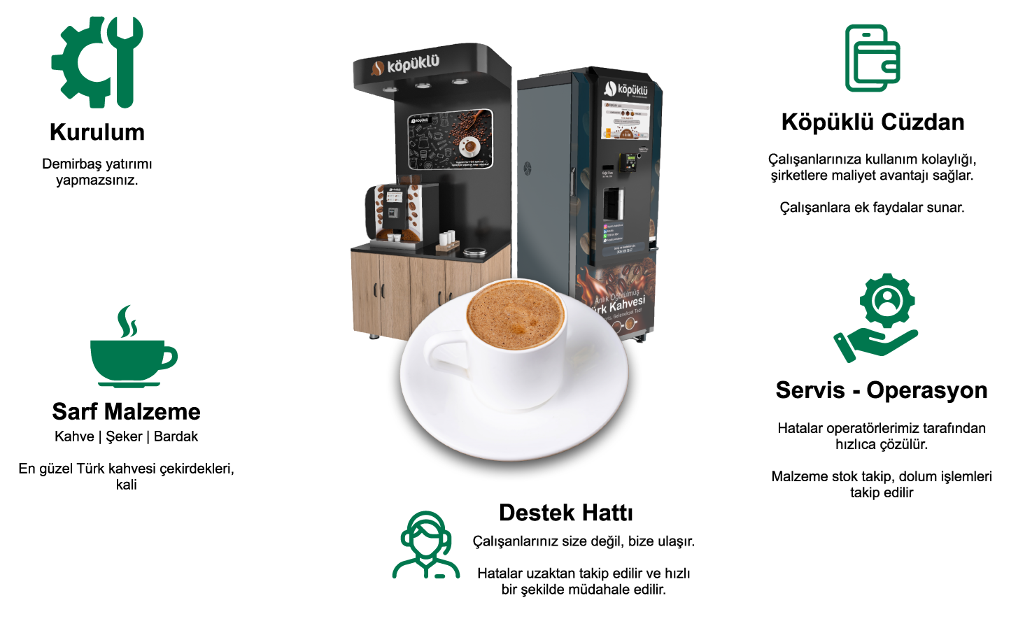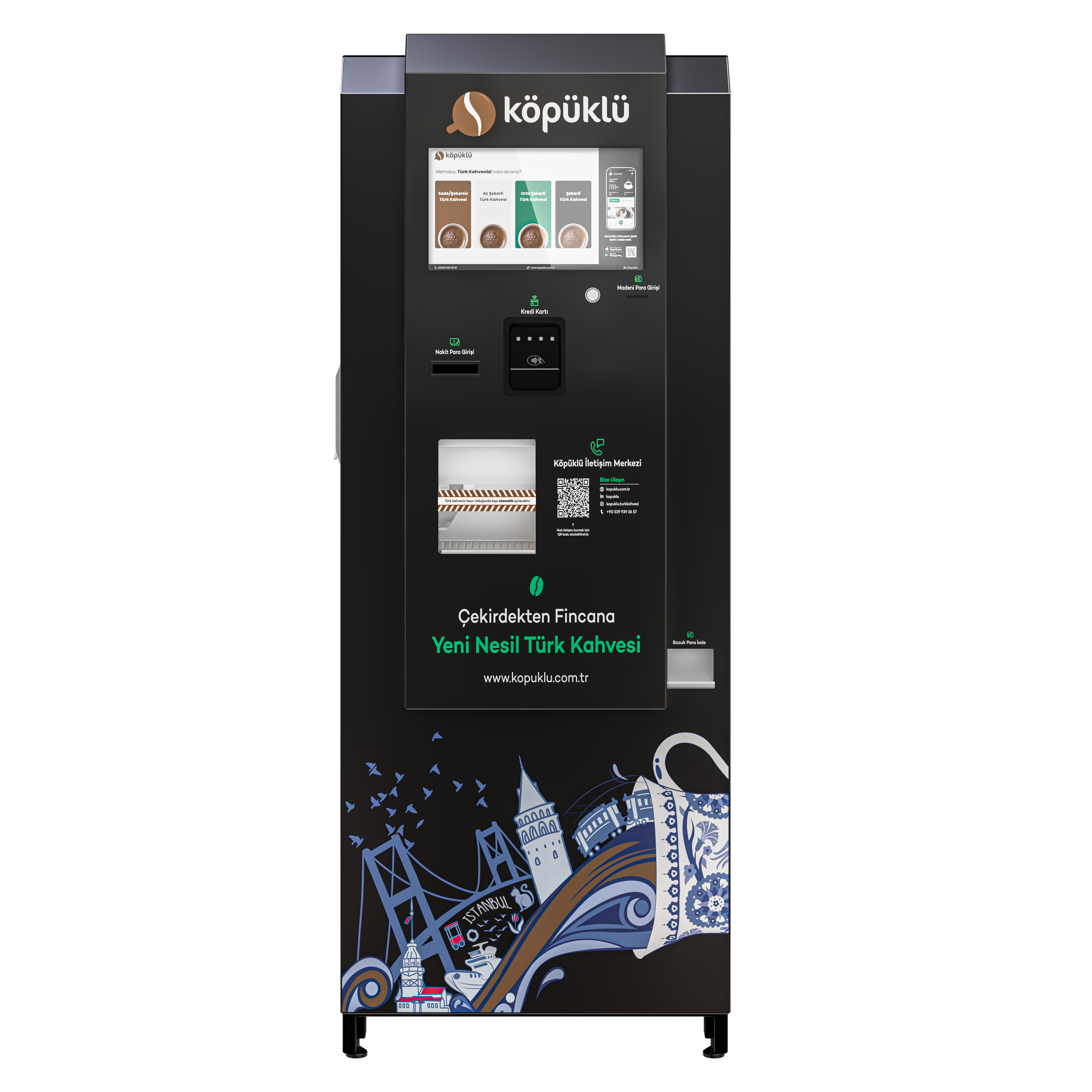 Köpüklü içerisinde kahve çekirdeklerini, şekeri, suyu bulunduran; üzerindeki dokunmatik ekranından şeker seviyesi seçildikten sonra sırasıyla kahve çekirdeklerini öğüten, şeker ve su ekleyen, kendine özgü yöntemiyle karıştıran, cezvede pişiren, bardakta servisini yapan, sonrasında da kendisini temizleyen ve farklı ödeme yöntemlerini kabul edebilen tam otomatik bir “Türk Kahvesi Satış Makinesi” dir.